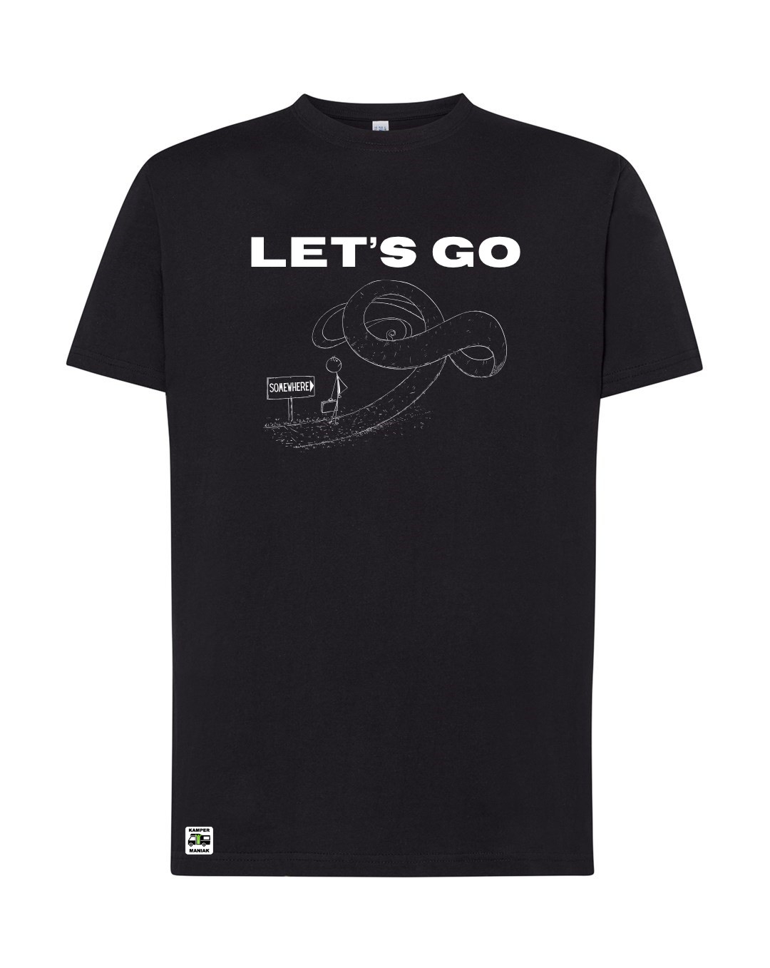 Prezentujemy koszulkę LET'S GO, która zaprasza do spontanicznych podróży i poszukiwania nowych przygód! Na przodzie koszulki dominuje duży napis LET'S GO, który stanowi bezpośrednie wezwanie do działania. Tył koszulki jest gładki, bez nadruku. Z przodu po prawej stronie, na dole, znajduje się logo KamperManiak.
