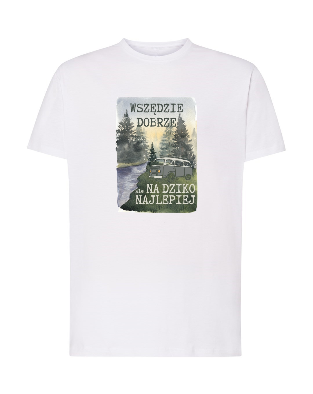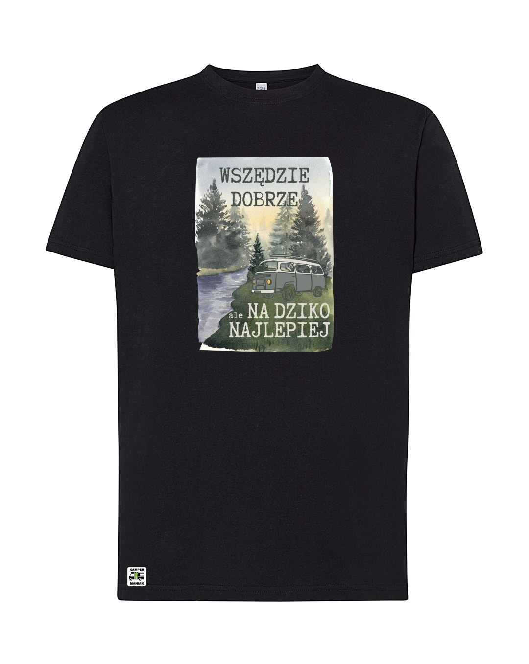 Prezentujemy koszulkę WSZĘDZIE DOBRZE ALE NA DZIKO NAJLEPIEJ, stworzoną dla miłośników natury i swobodnego podróżowania na dziko! Tył koszulki jest gładki, bez nadruku. Z przodu po prawej stronie, na dole, znajduje się logo KamperManiak.