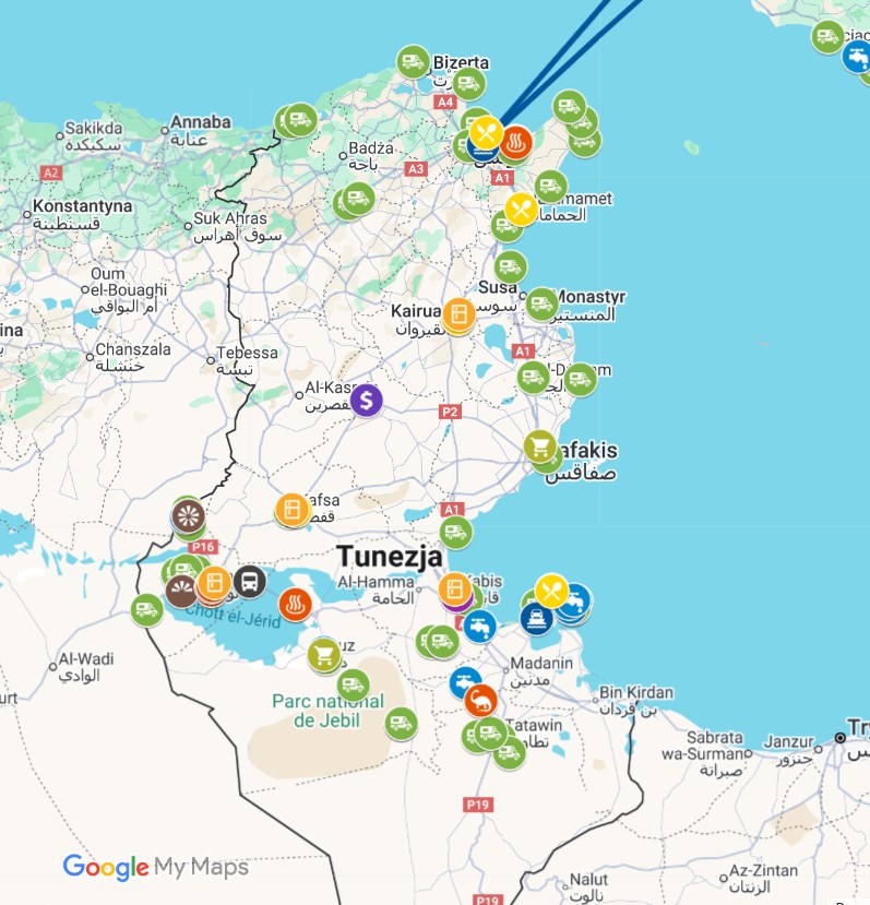 Na naszej mapie znajdują się wszystkie atrakcje oraz ciekawostki, które odwiedziliśmy w Tunezji . Polecamy przed przyjazdem zaplanować wizytę korzystając z zaznaczonych miejsc, które obfitują licznymi atrakcjami.